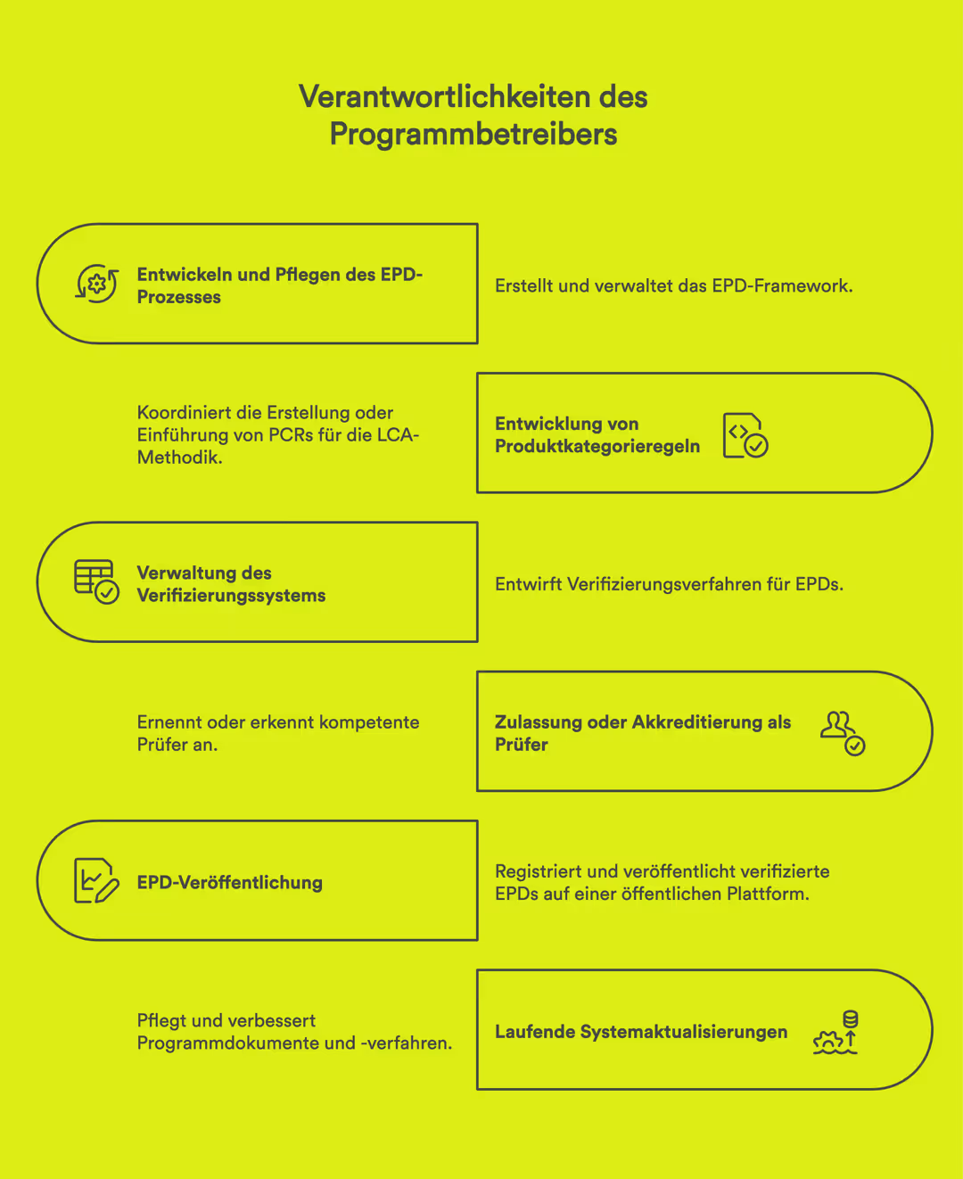 Programmhalter verwalten das EPD-System, indem sie Standards definieren, Produktkategorieregeln (PCRs) entwickeln und den Prüf- und Veröffentlichungsprozess gemäß ISO 14025 und EN 15804 überwachen.