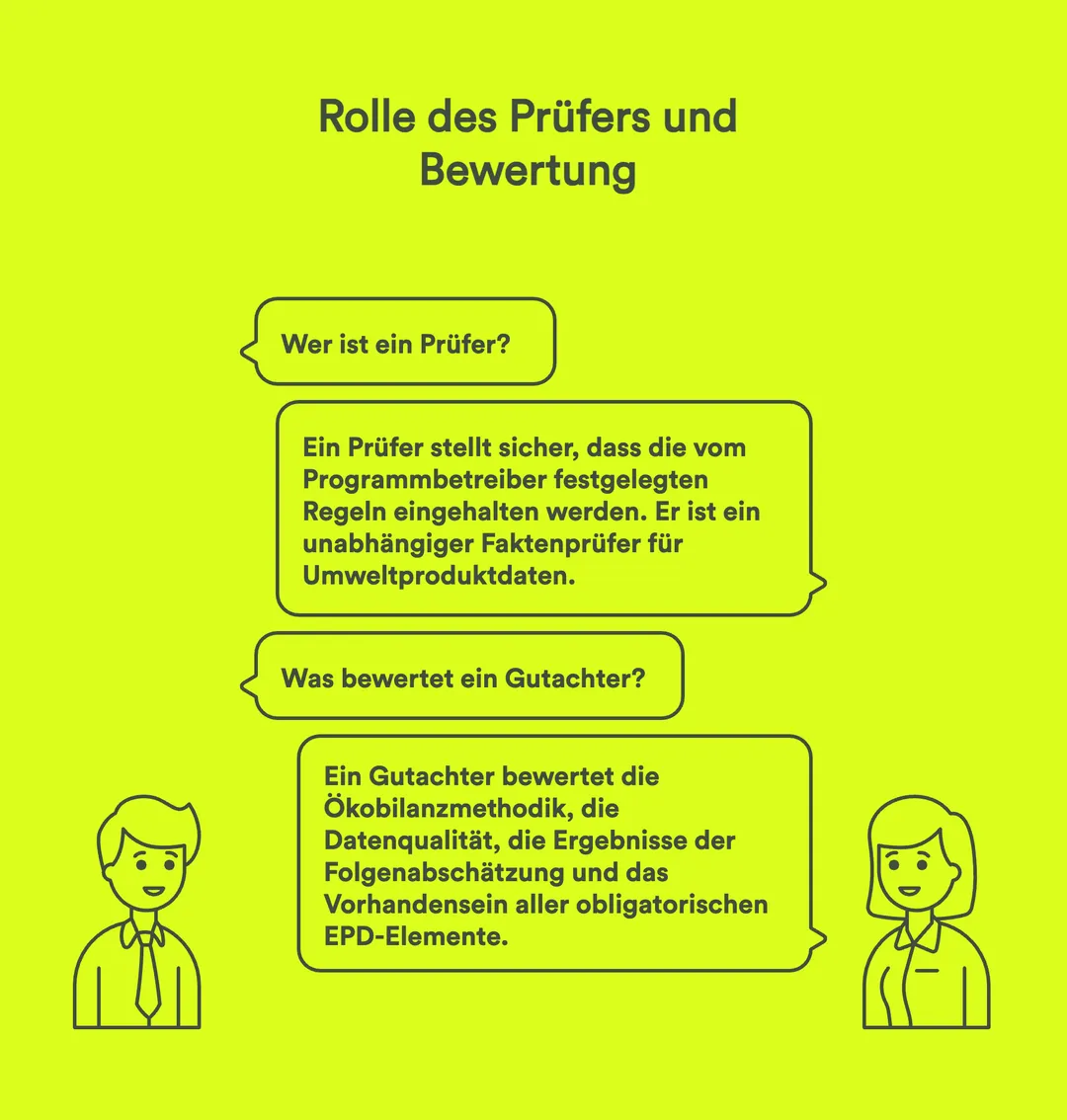 Prüfer/Verifizierer sind unabhängige, qualifizierte Fachleute, die vom Programmhalter anerkannt werden. Sie prüfen die Daten der Lebenszyklusanalyse und die EPD auf Konformität, Transparenz und methodische Strenge.